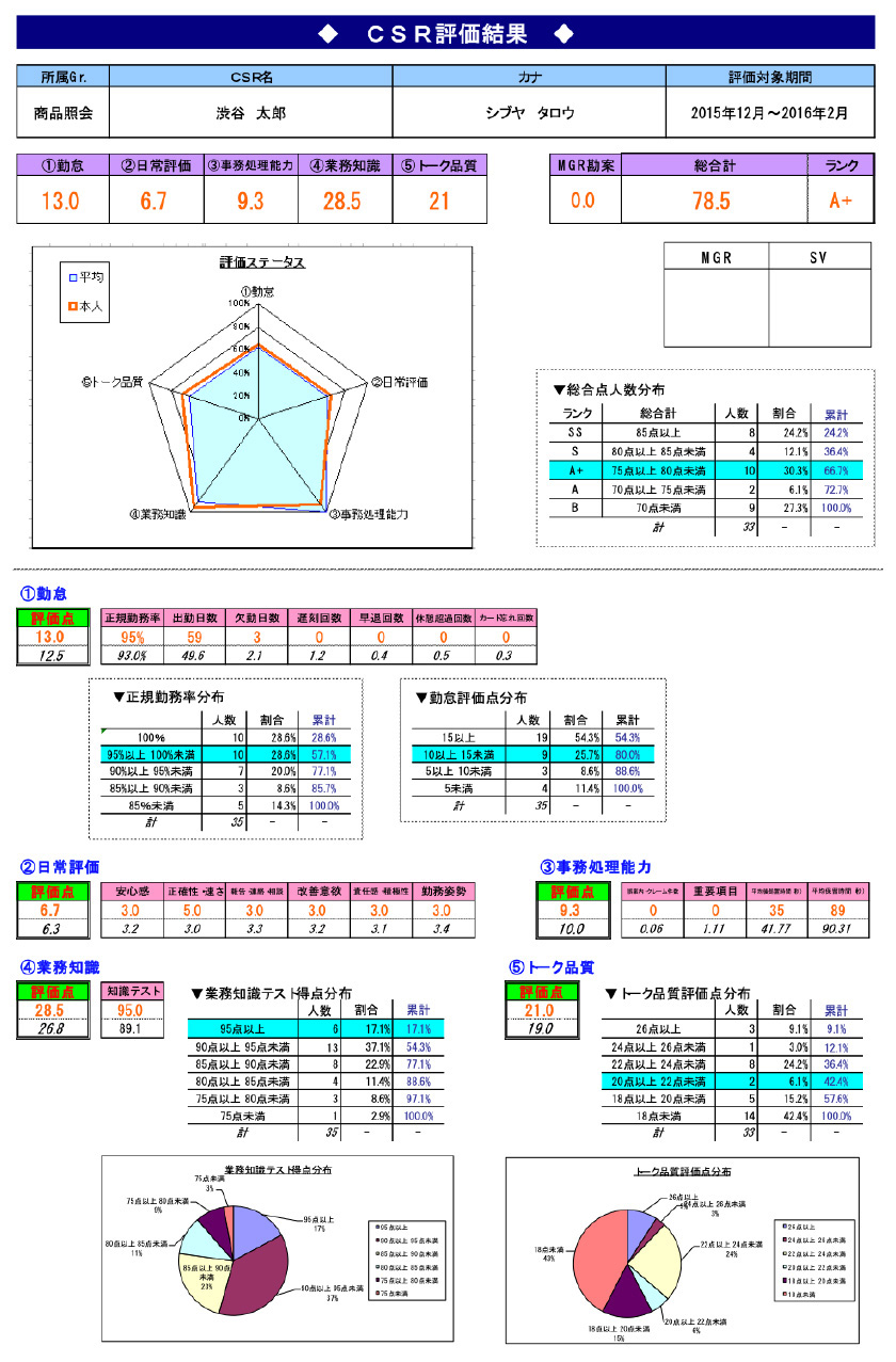 弊社は生産性向上のため、スタッフのモチベーション管理とコミュニケーションを重要視しています。コンタクトセンターでの全体の生産性は応答率と稼働率、個々のオペレーターの生産性はCMSでとれるACD/ACW(通話時間/後処理時間)や保留回数、エスカレーション率などのデータをもとに測定することが一般的であるため、CMSデータによる単純な効率のみの評価だと効率重視で単純作業としてのみの評価に偏り高度な人材の総合評価ができていないことがあります。