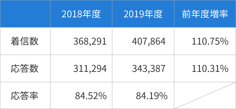 2019年度は、前年比110%超の着信数を記録したが、効率的な人材配置・マルチ業務運用などの各施策を活用したことで、人数は変わらずに応答数を増加、前年同水準の応答率を維持することができた